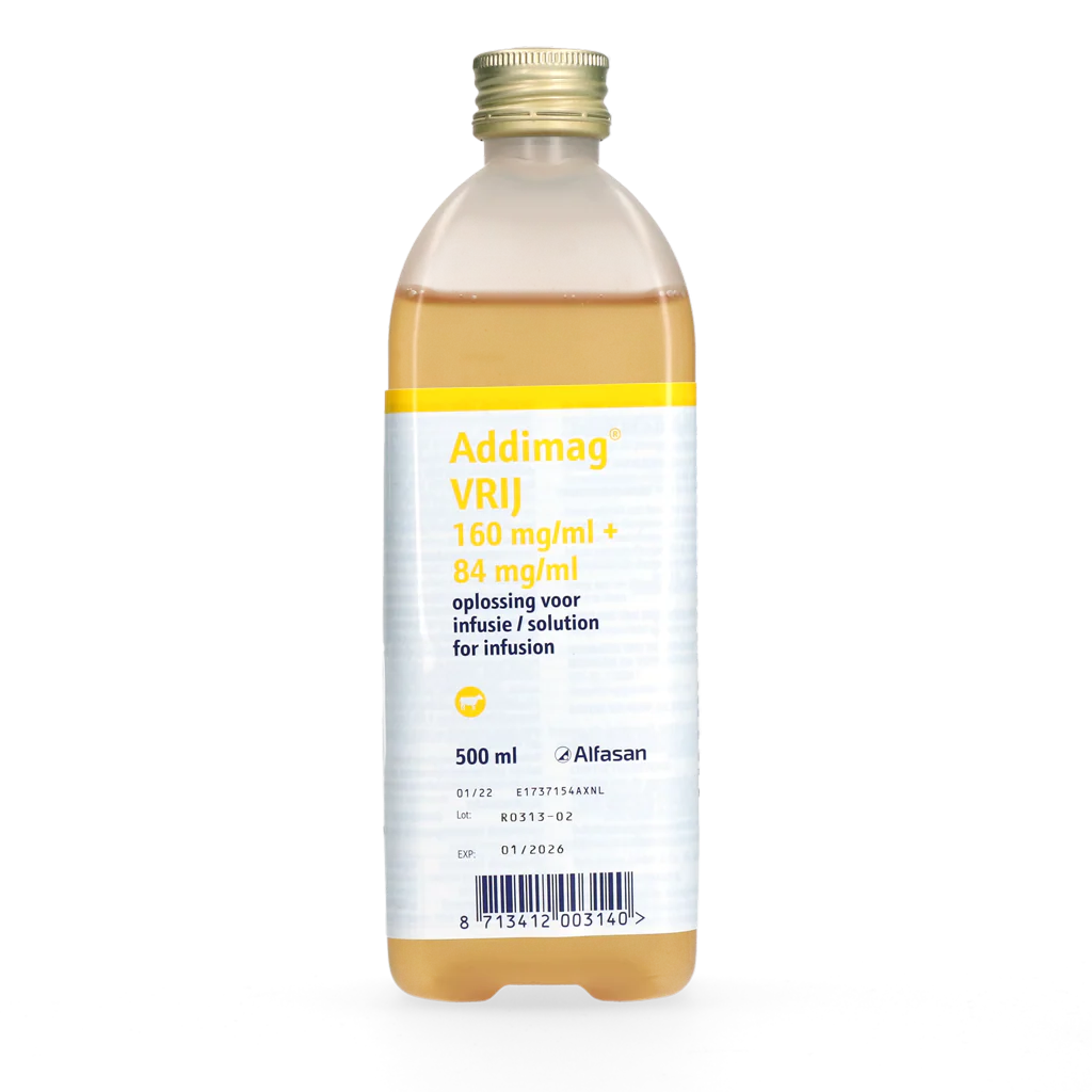 Oplossing voor infusie voor runderen ter behandeling van kopziekte en melkziekte met calcium, magnesium en een hoog aandeel energie in de vorm van gluconaat-monohydraat.