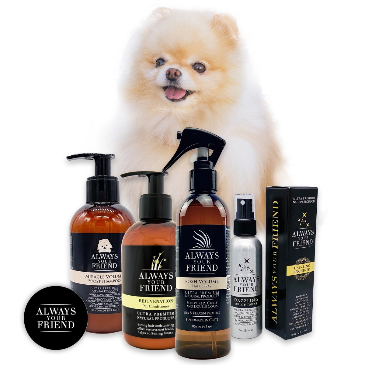 Wil je de beste vachtverzorgingsproducten voor je Pomeranian? Zoek dan niet verder! De Always Your Friend Pom Set is speciaal ontworpen voor het onderhouden van een mooie volumineuze vacht van Pomeranians/Dwergkeesjes, maar is natuurlijk ook geschikt voor andere rassen met een dubbele vacht of krulvacht die wel wat extra volume kan gebruiken! Deze producten maken de vacht volumineus, zacht, glanzend en makkelijk doorkambaar.