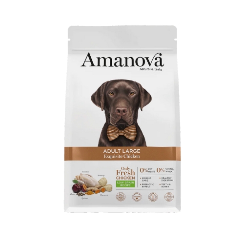AM Adult Large Exquisite Chicken is speciaal ontwikkeld voor volwassen honden van grote rassen. Deze complete en hypoallergene voeding is bereid met vers kippenvlees als enige dierlijke eiwitbron en sluit perfect aan bij de voedingsbehoeften van grotere honden met een actieve levensstijl.