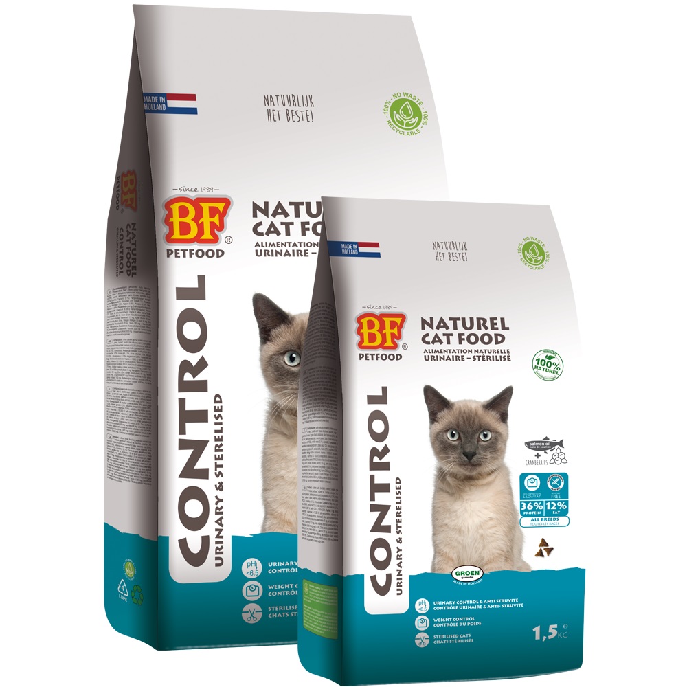 Biofood Control is een hoogwaardige en volledige kattenvoeding uit het premium assortiment. De premium kattenvoeding bevat extra veel vlees en is tarwevrij. Deze brok is speciaal ontwikkeld voor gesteriliseerde katten en indoor katten en helpt overgewicht te voorkomen. Ook ondersteunt het de urinewegen en helpt struvietaandoeningen zoals blaasgruis en stenen te voorkomen.
