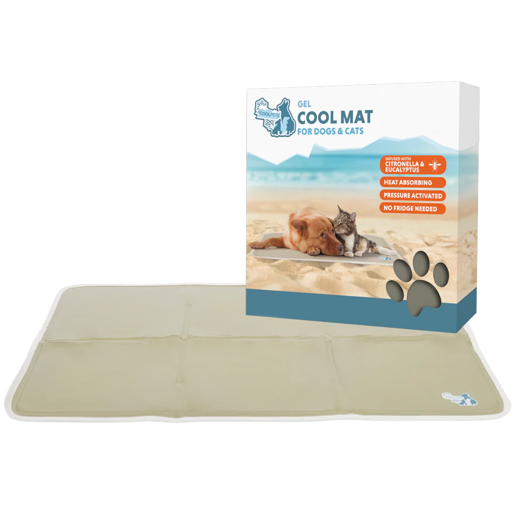 De Coolpets Gel Cooling Mat Beige bevat een vaste gel, verrijkt met citronella en eucalyptus. Deze verkoelende mat helpt honden het hoofd koel te houden tijdens warme dagen en ondersteunt de regulatie van de lichaamstemperatuur om oververhitting te voorkomen.