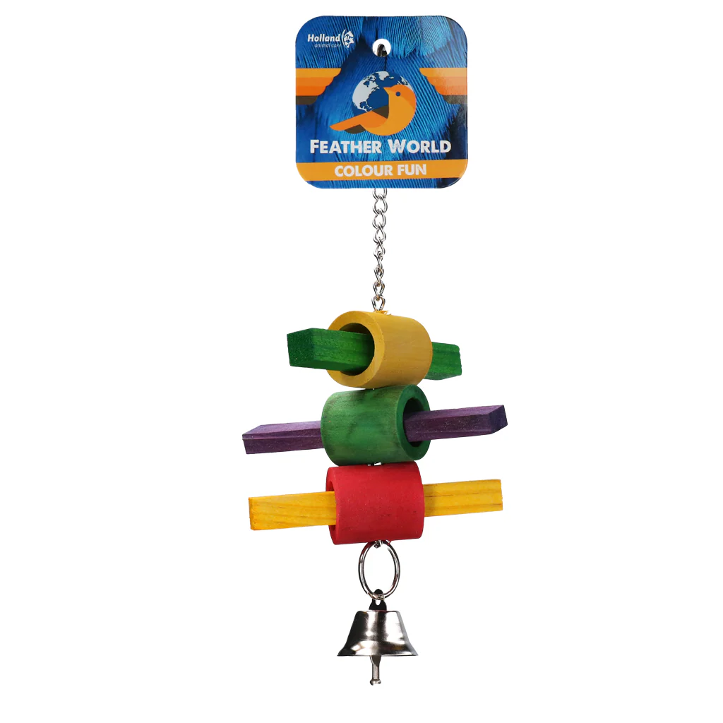 Dit speeltje past in iedere kooi en bestaat uit houten deeltjes aan een kettinkje.