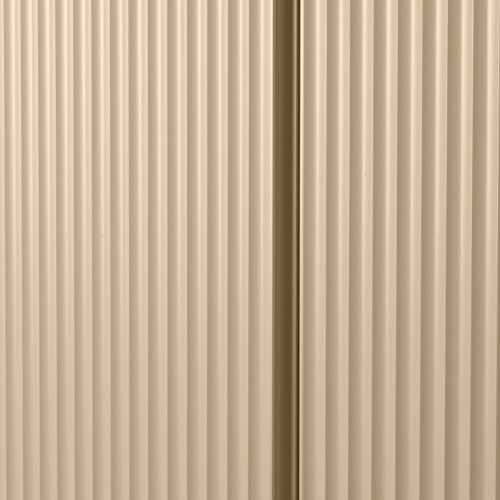 Het meubel heeft afgeronde hoeken en een uniek patroon op de deuren, wat zorgt voor een vriendelijk en speels uiterlijk.
