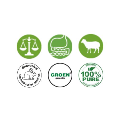 Analytische bestanddelen – Ruw eiwit 18,0%, Ruw vet 12,0%, Anorganische stof 6,0%, Ruwe celstof 2,7%, Vochtigheid 8,0%, Calcium 1,2%, Fosfor 0,8%. Additieven per kg. Nutritionele toevoegingsmiddelen: Vitamine A 18.000 IE, Vitamine D3 1.800 IE, Vitamine E (all-rac-alfa-tocoferylacetaat) 375 IE, Koper (koper(II)sulfaat, pentahydraat) 5,0 mg, Zink (zinksulfaat, monohydraat) 65 mg, IJzer (ijzer(II)sulfaat, monohydraat) 50 mg, Mangaan (mangaan(II) oxide) 35 mg, Jodium (calciumjodaat, watervrij) 1,5 mg, Seleen (natriumseleniet) 0,15 mg, Taurine 100 mg, L-carnitine 300 mg. Bevat natuurlijke antioxidanten en conserveermiddelen.