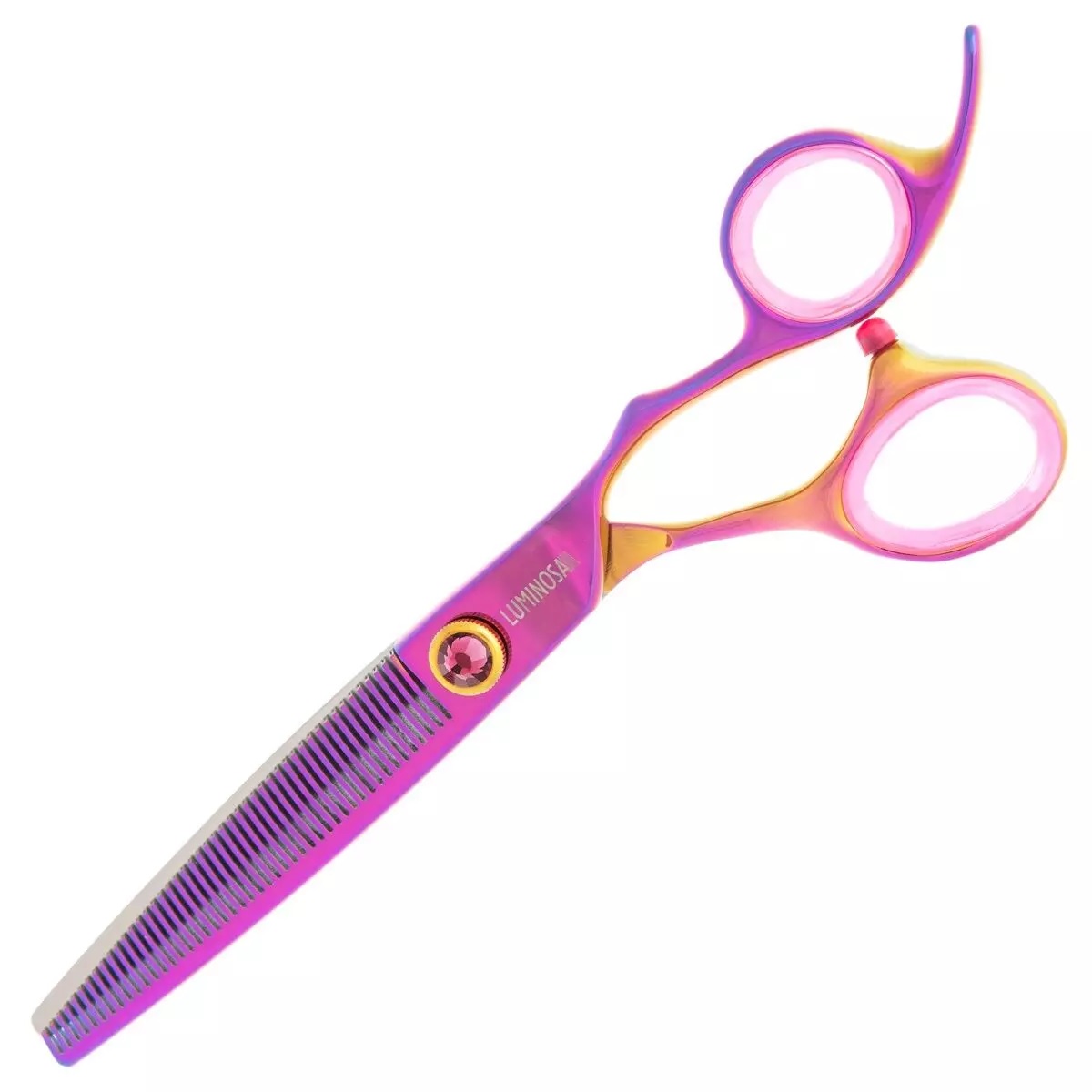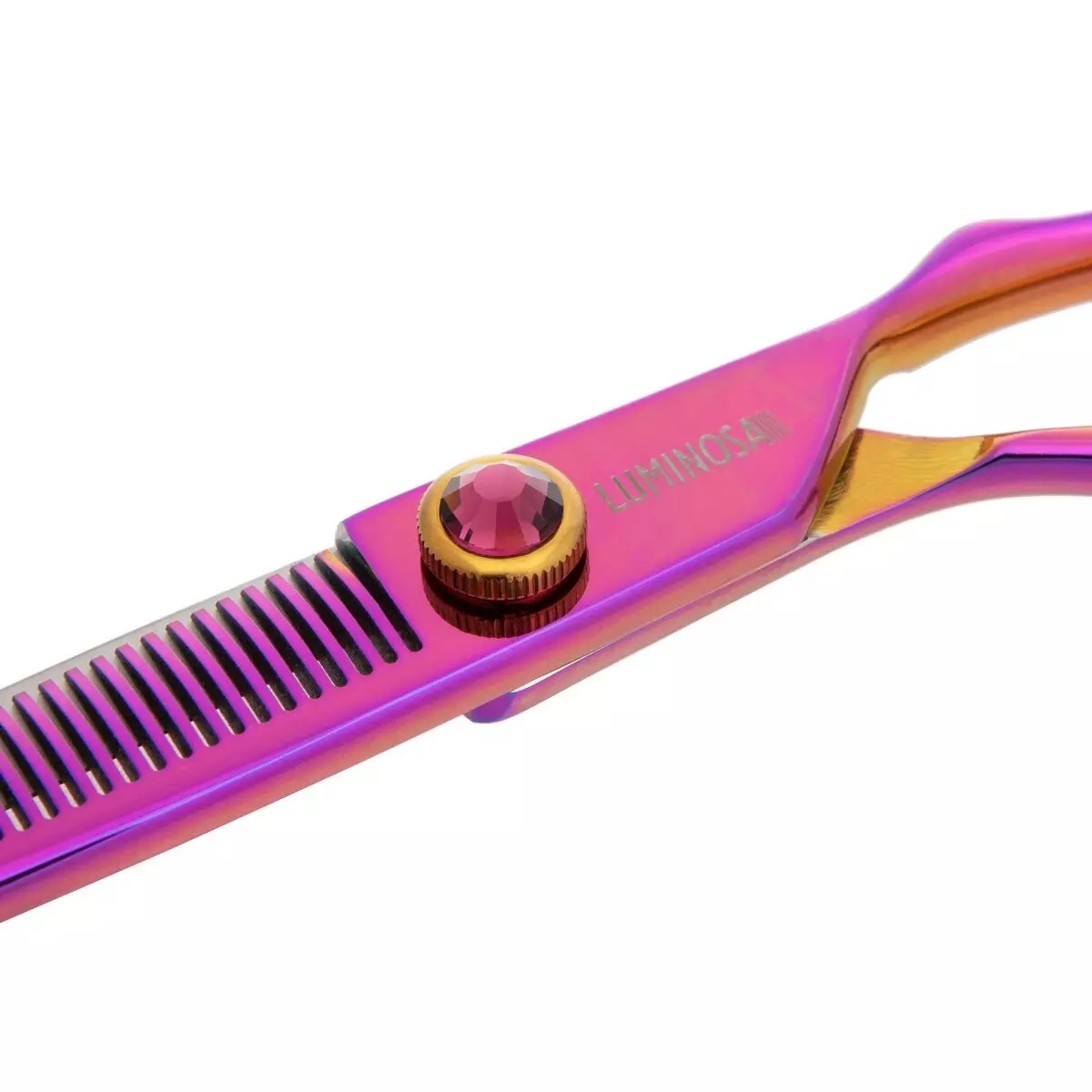 Deze prachtige professionele effileerschaar is gemaakt van hoge kwaliteit Japans VG10 roestvrij staal. De Groom Professional Luminosa effileerschaar ligt comfortabel in de hand en heeft zachte, rubberen scharenringen. Afgewerkt in regenboog design met paarse edelsteen verstelbare spanschroef. De kleur van het staal valt wat zachter uit dan op de productfoto’s.