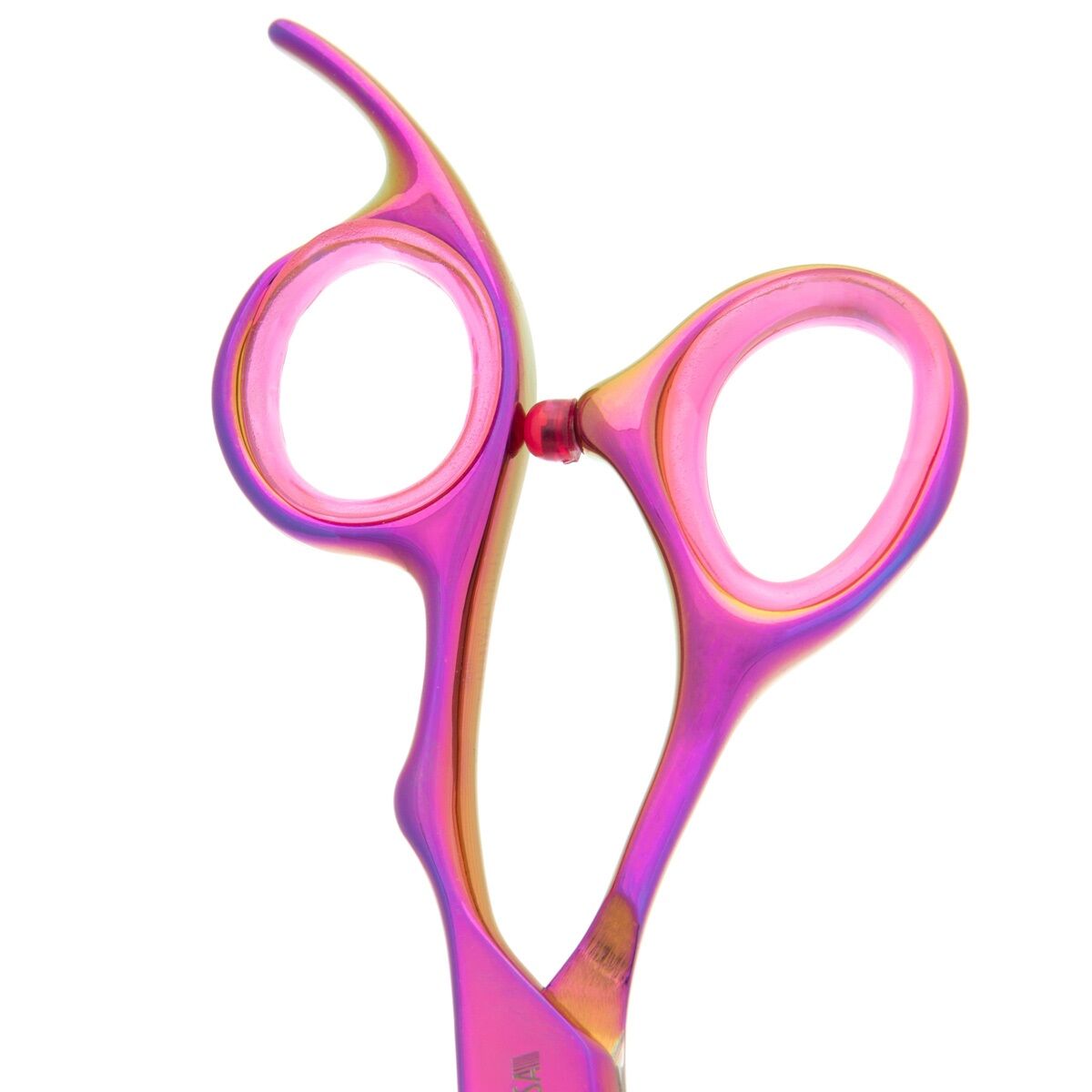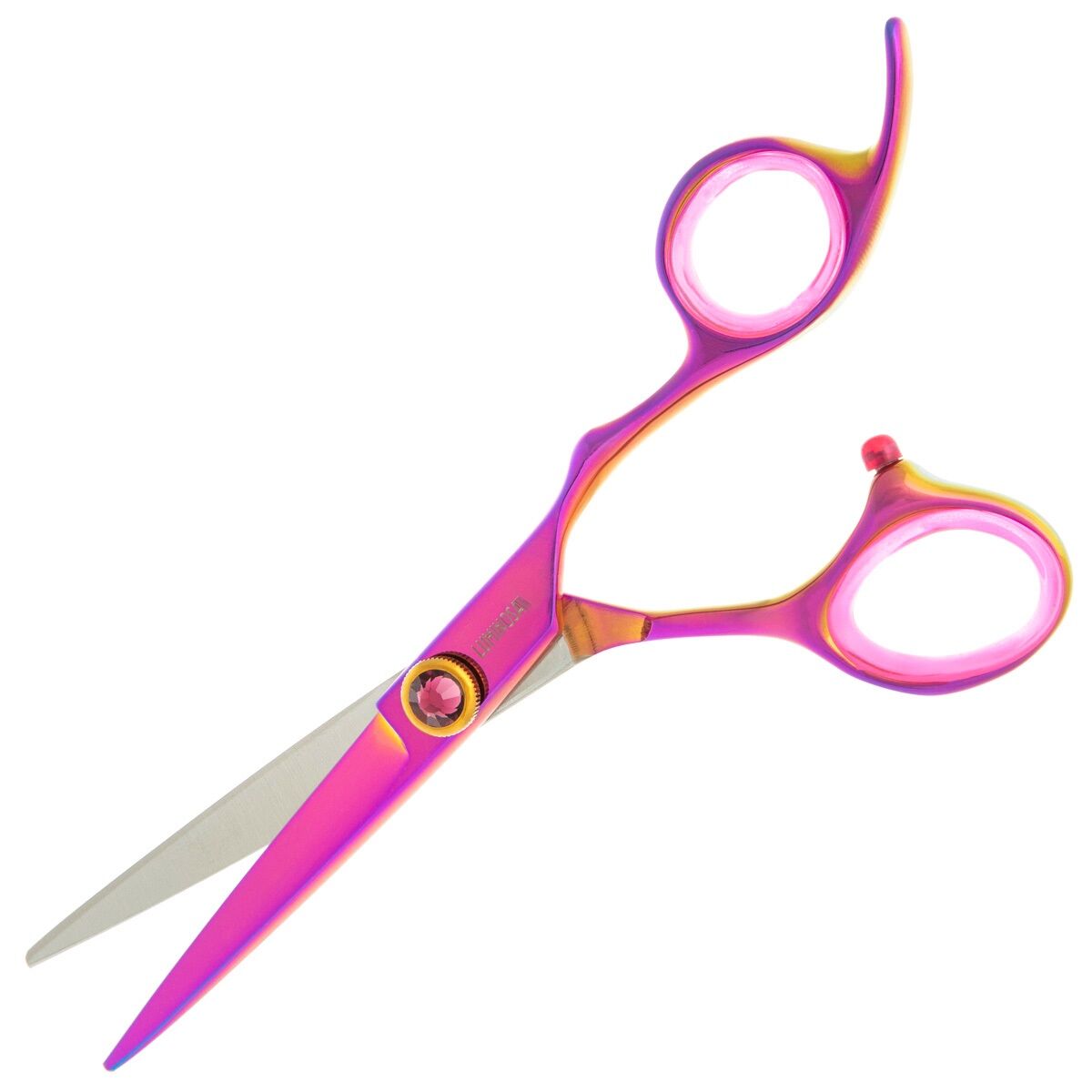 Deze prachtige professionele rechte schaar is gemaakt van hoge kwaliteit Japans VG10 roestvrij staal. De Groom Professional Luminosa rechte schaar ligt comfortabel in de hand en heeft zachte, rubberen scharenringen. Afgewerkt in regenboog design met paarse edelsteen verstelbare spanschroef. De kleur van het staal valt wat zachter uit dan op de productfoto’s.
