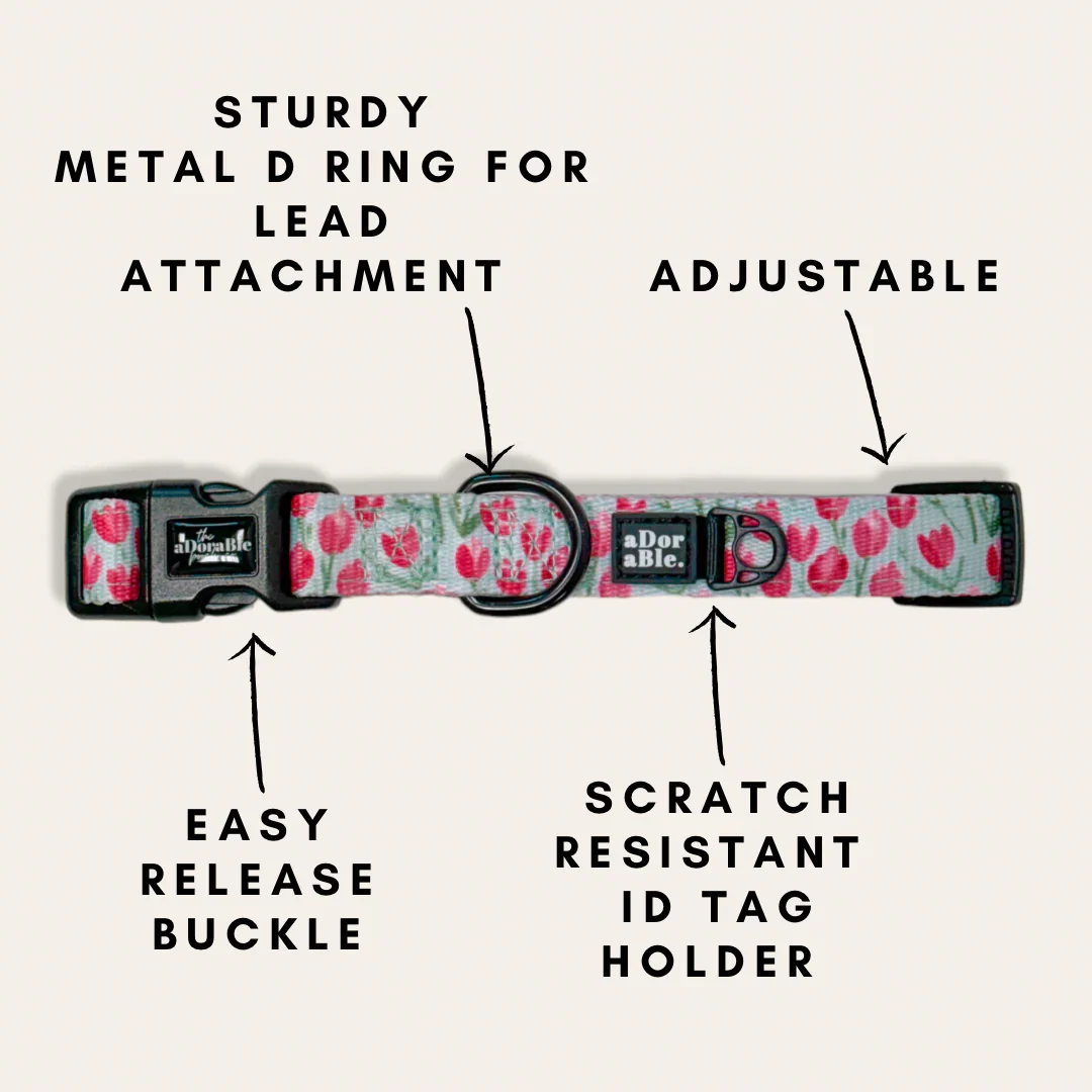Laat jouw viervoeter stralen in deze tijdloze tulpenprint. De Timeless Tulips halsband combineert elegantie met comfort en is een echte blikvanger tijdens wandelingen. Dankzij de zachte voering en verstelbare sluiting zit de halsband niet alleen mooi, maar ook erg comfortabel voor je hond.