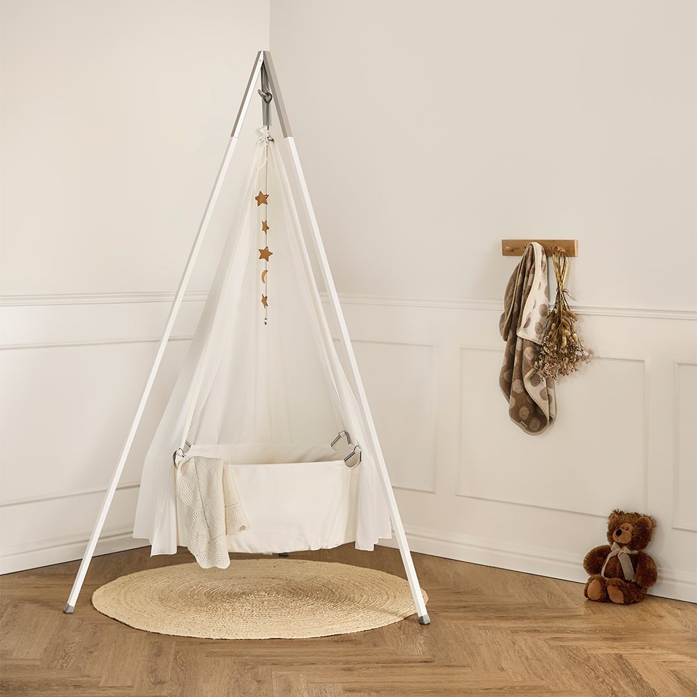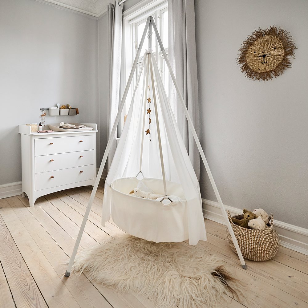 Mocht de mogelijkheid er niet zijn om de hangwieg aan het plafond te hangen, dan kan er gekozen worden voor het speciaal ontworpen statief van Leander. En op deze manier kan het ook nog eens gemakkelijk verplaatst worden, van de ene naar de ander kamer, net daar waar jouw baby graag slaapt.