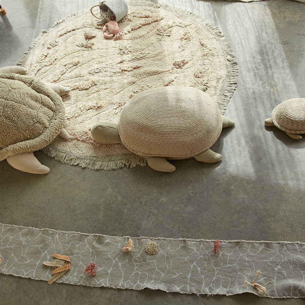 We zwemmen mee op de rug van mevrouw Turtle en ontdekken de wonderen van de oceaan. Laat je verrassen door de vormen en kleuren van de zeewonderen en een beetje fantasie doet de rest. Deze collectie laat de schoonheid van de wereld onder water zien door middel van zachtgekleurde tapijten met interactieve ontwerpen en speelgoed van textiel.