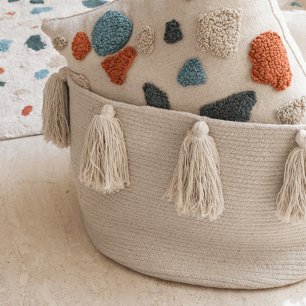 Naast de Lorena Canals vloerkleden hebben ze in Barcelona ook een uitgebreide collectie aan sierkussens, opbergmanden, slingers en super leuke poefs ontworpen. Alle kleuren van de bijpassende decoraties zijn afgestemd op de kleuren van Lorena Canals vloerkleden, daardoor kun je ze prachtig met elkaar combineren. Onwijs populair in de collectie is de Monstera leaf rug. Ook daarvan zijn verschillende maten, kleuren, kussens en mandjes beschikbaar, mix and match zoals je zelf wilt.