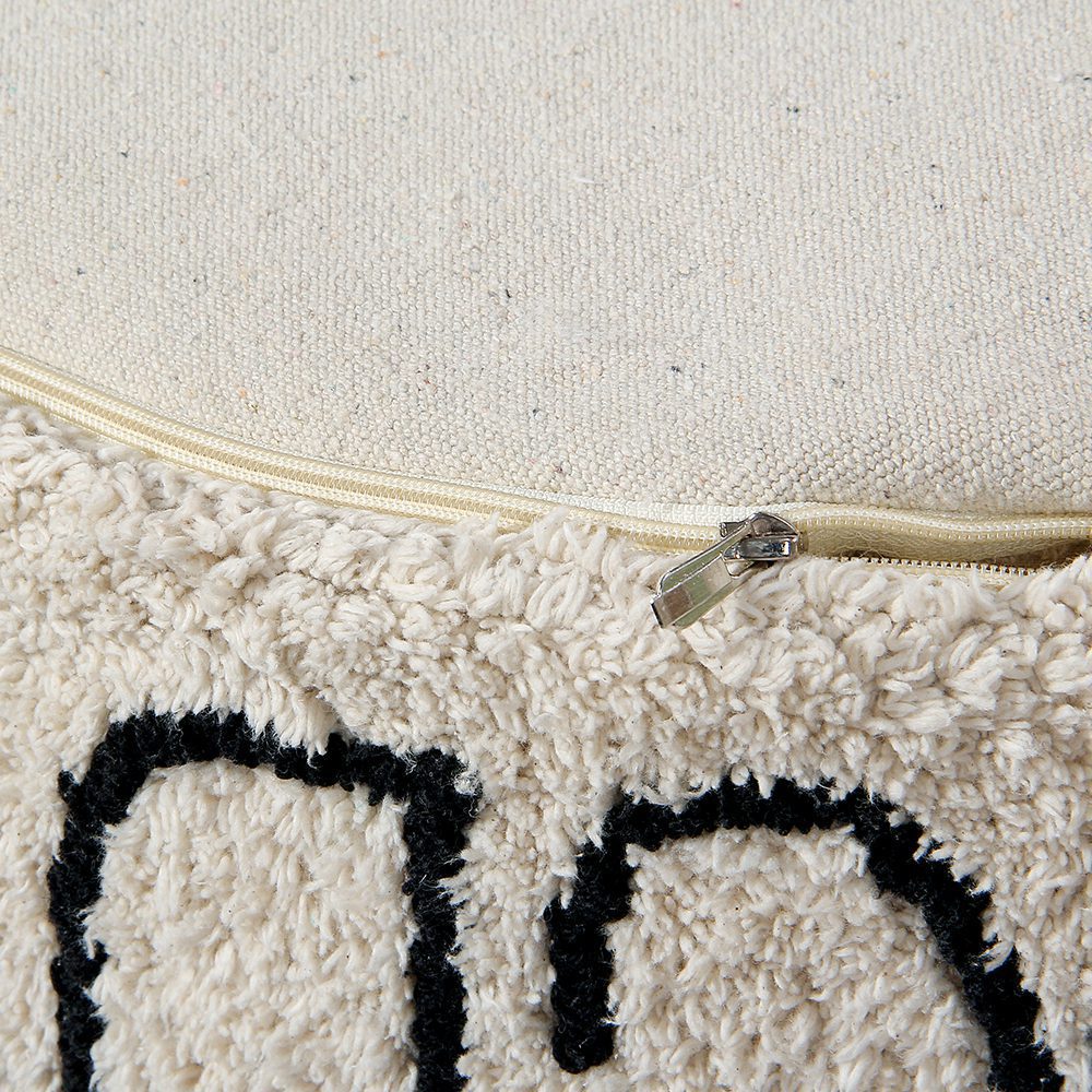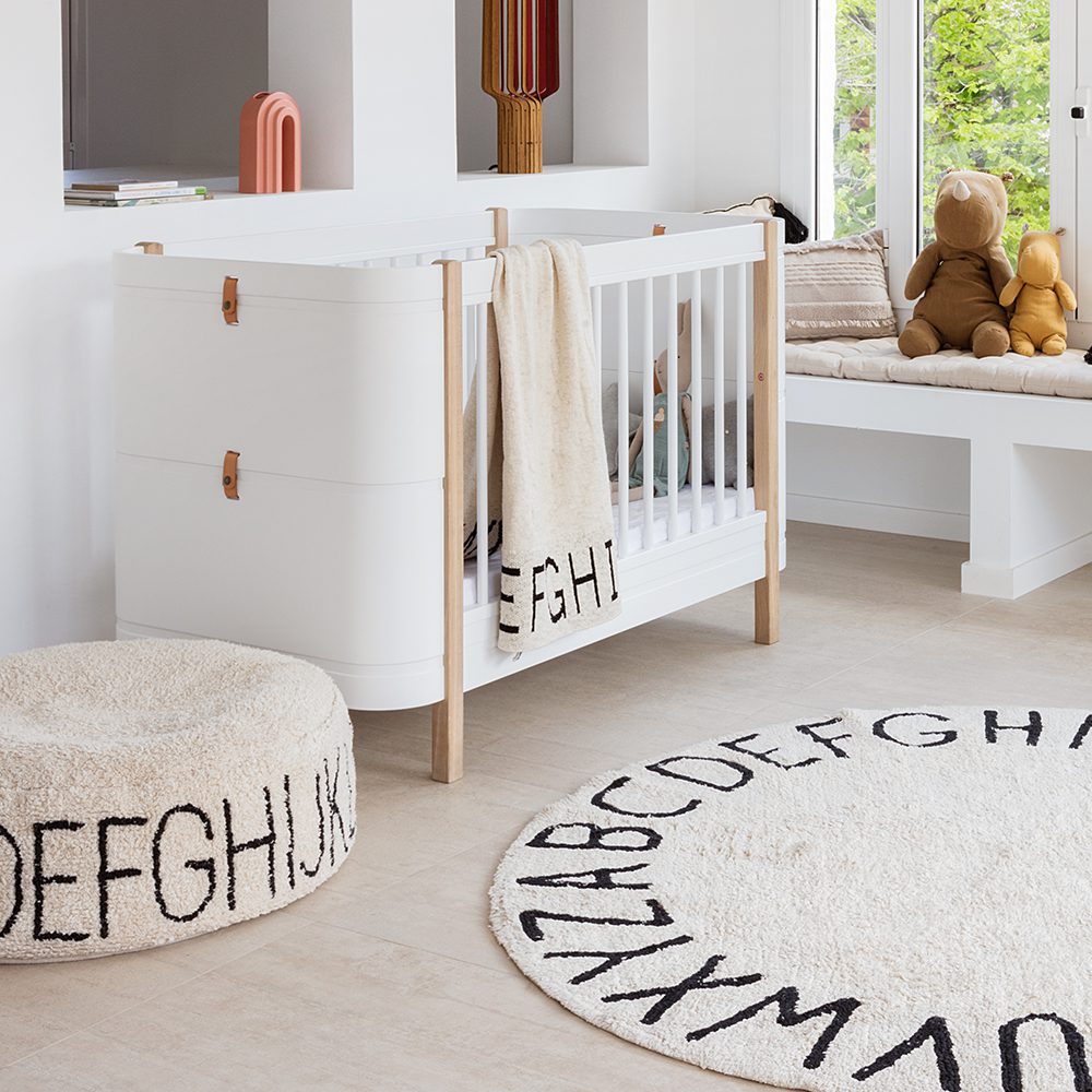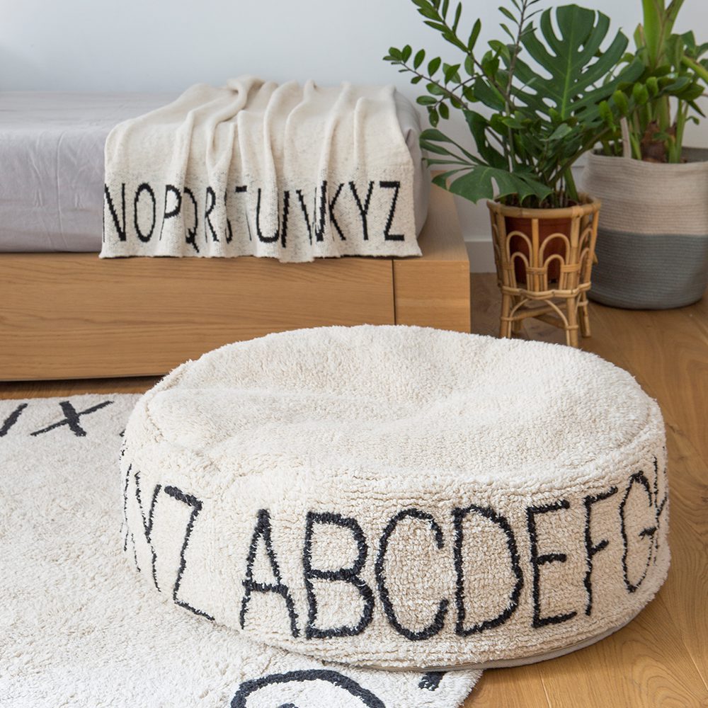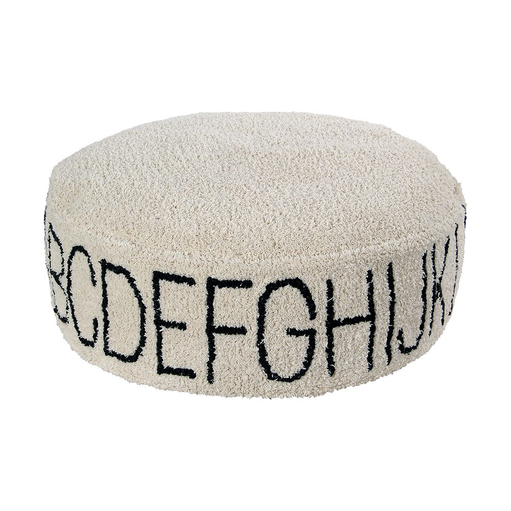 Deze ronde brede poef in een natuurlijke basiskleur en met de letters van het alfabet is een echte eye-cather in de babykamer. De boven- en zijkanten zijn bedekt met zachte pool en de onderkant is gemaakt van katoenen canvas die is afgewerkt met een ritssluiting. Binnenin een verwijderbare vulling met polystyreen parels zodat je de hoes gemakkelijk kan wassen na een klein ongelukje.