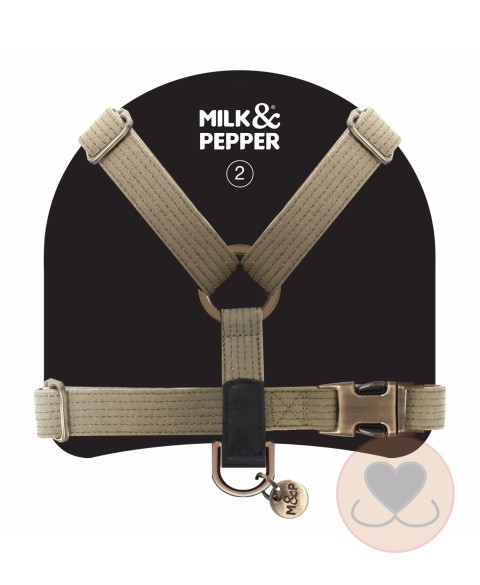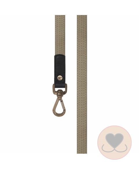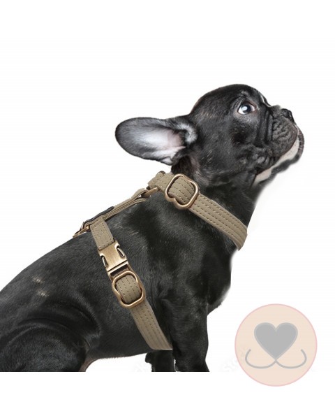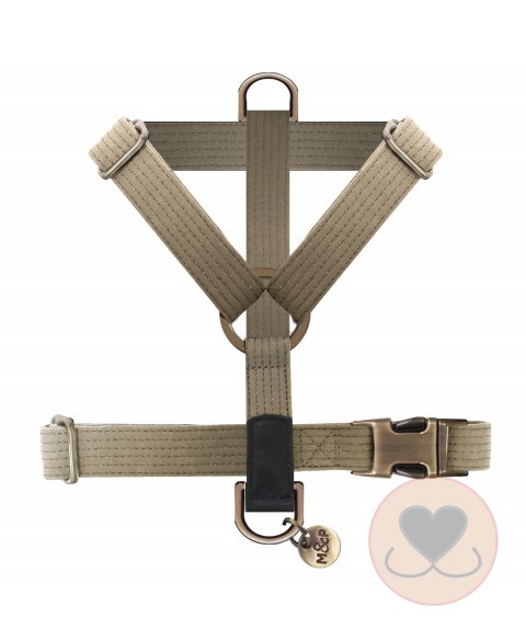 - “H” verstelbaar harnas in gestikt beige of kaki gabardine met zwarte vintage leerachtige afwerking