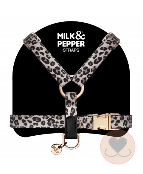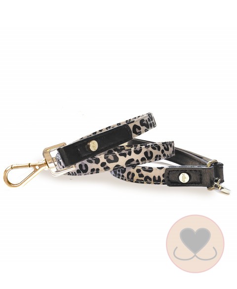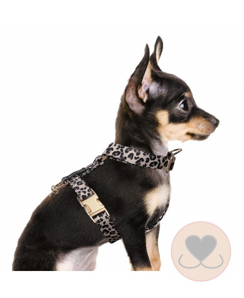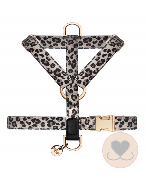 - “H” verstelbaar harnas van polyester met luipaardprint en zwart generfde imitatie lederen afwerking