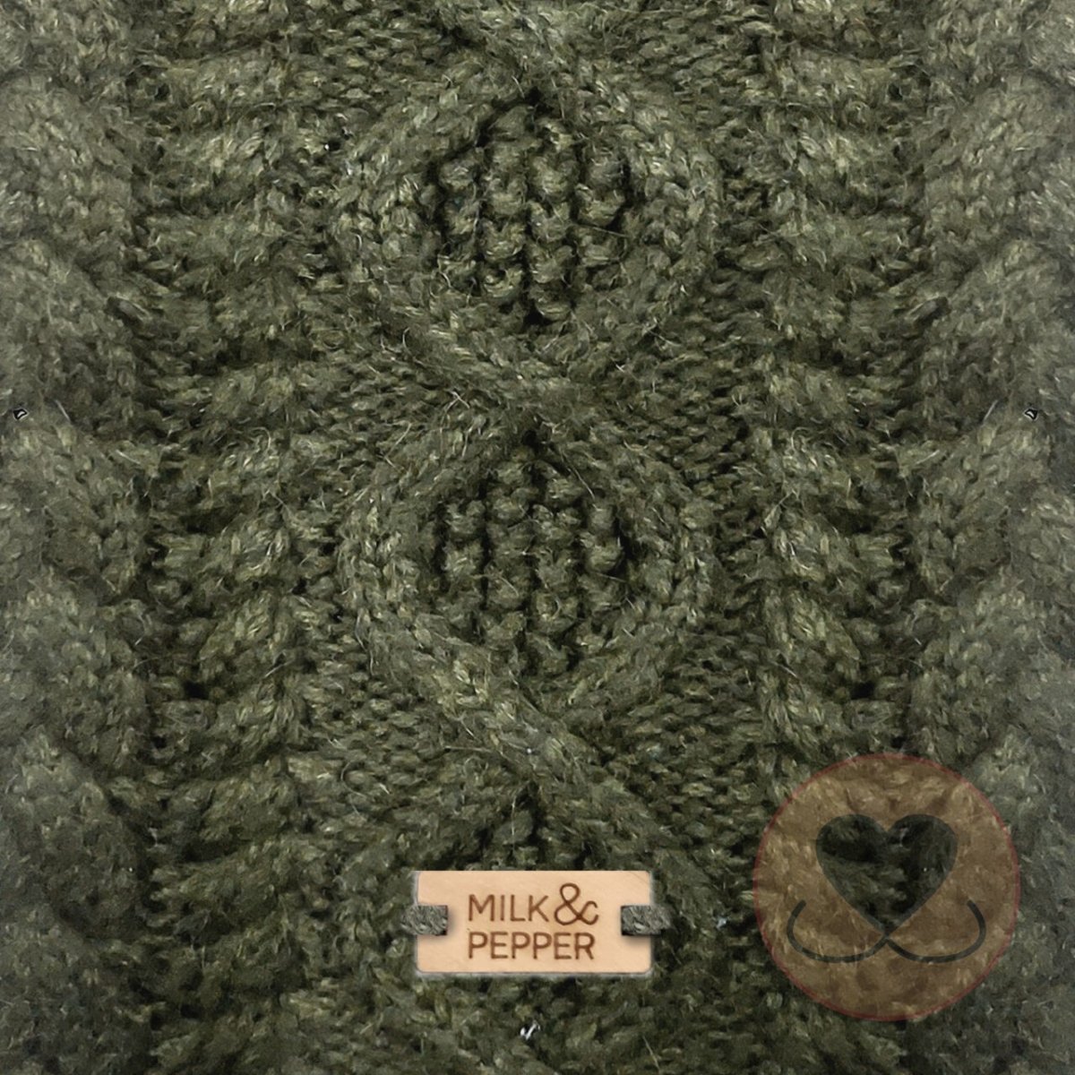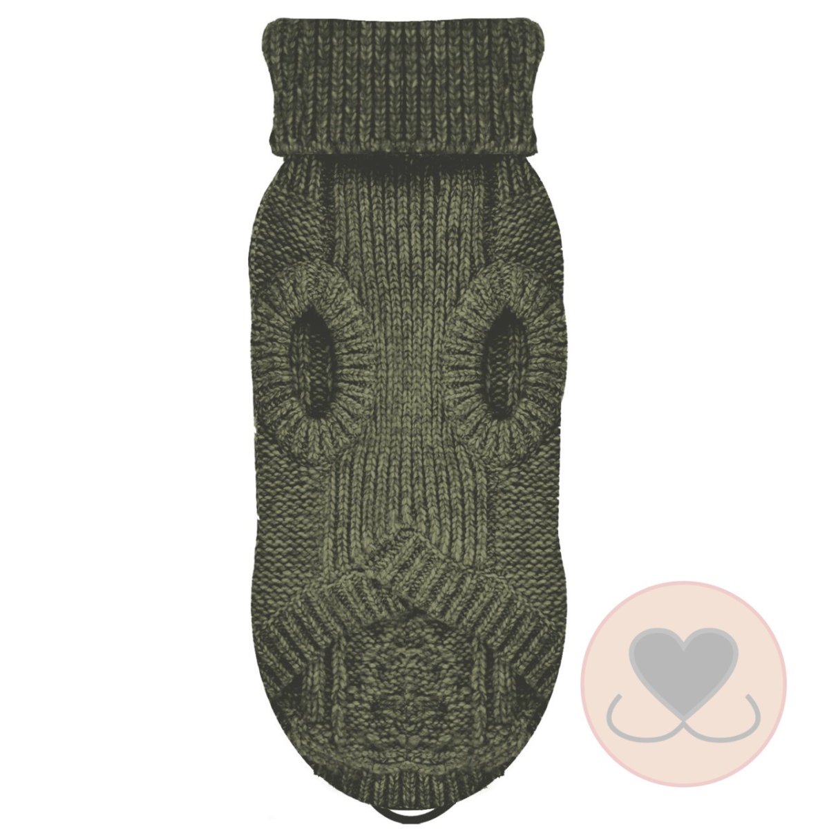 Mooie hondentrui in de kleur kaki met ingebreid kabel patroon en een heerlijk warm opstaande col.