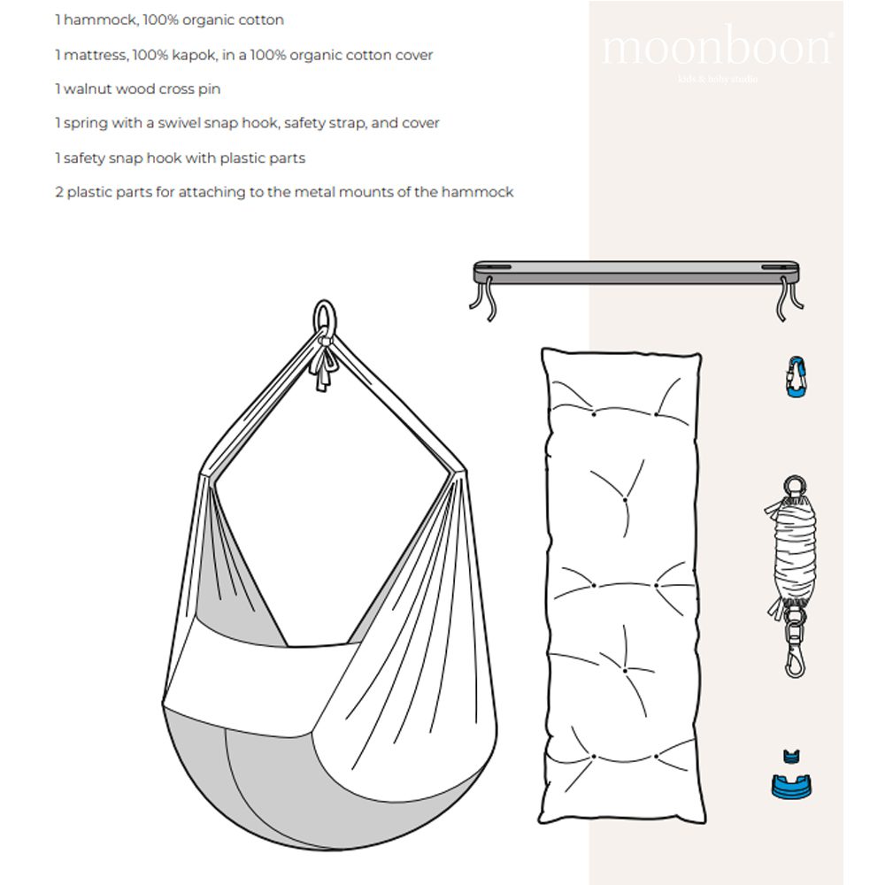 Een andere redder in nood is de Moonboon motor voor de babyhangmat, deze machine doet het schommelen voor je, dus we raden je echt aan om deze ook te kopen! Deze motor is speciaal ontwikkeld, getest en goedgekeurd in Denemarken voor Moonboon en voldoet aan de hoogste kindveiligheidseisen. Natuurlijk is de babyhangmat uit te breiden met meer accessoires zoals de standaard als je de wieg niet graag in het plafond monteert en heerlijk zacht beddengoed.