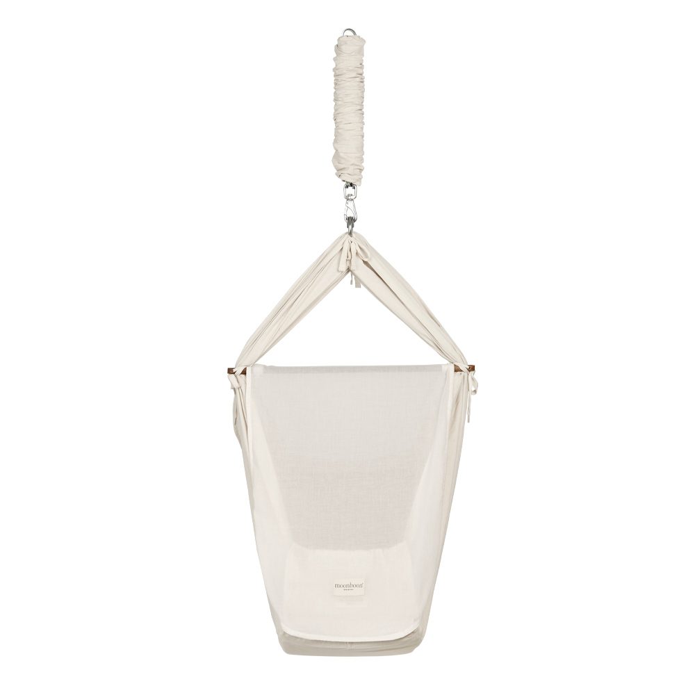 Gemaakt van 100% biologische GOTS-gecertificeerde voorgewassen katoenen voile en verkrijgbaar in mooie neutrale kleuren. De hoes is eenvoudig te installeren op de dwarsbalk van de babyhangmat met handige drukknopen en riemen om hem op zijn plaats te houden.