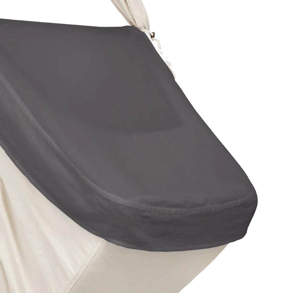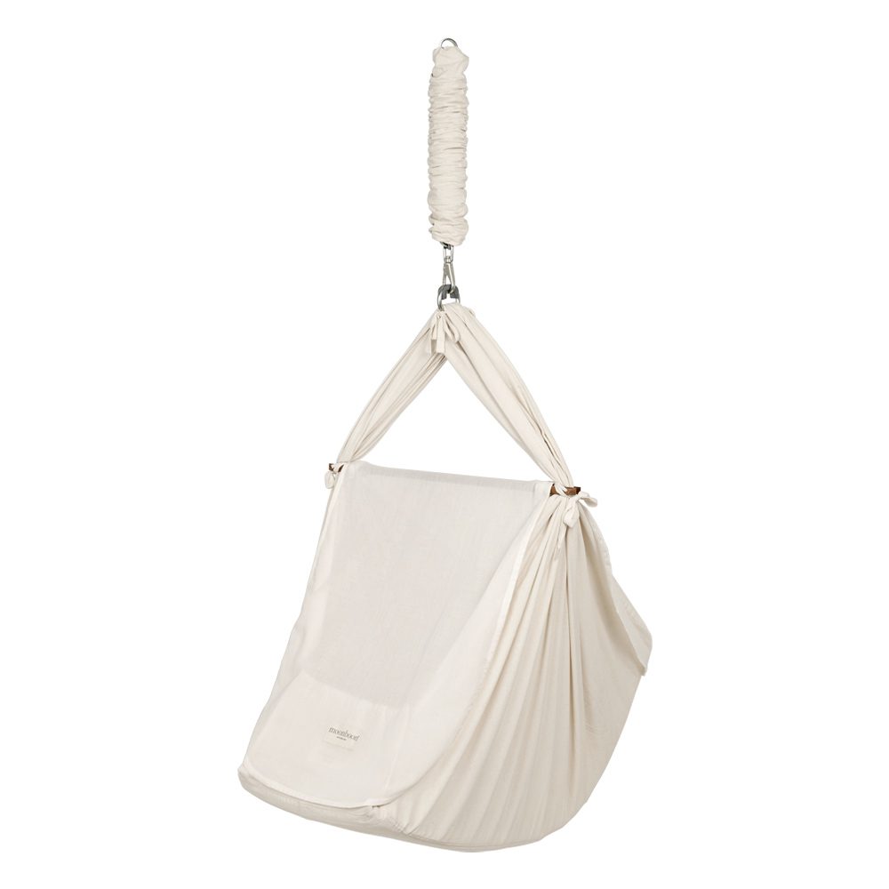 Gemaakt van 100% biologische GOTS-gecertificeerde voorgewassen katoenen voile en verkrijgbaar in mooie neutrale kleuren. De hoes is eenvoudig te installeren op de dwarsbalk van de babyhangmat met handige drukknopen en riemen om hem op zijn plaats te houden.