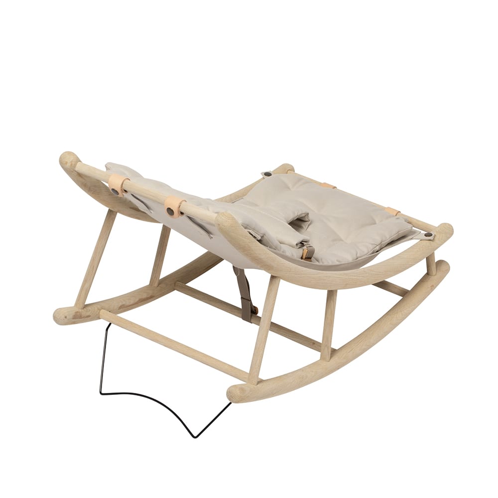 Het peuterzitje is door middel van leren banden en drukknopen aan de wipstoel bevestigd, hier bovenop is met klittenband het babykussen te bevestigen.