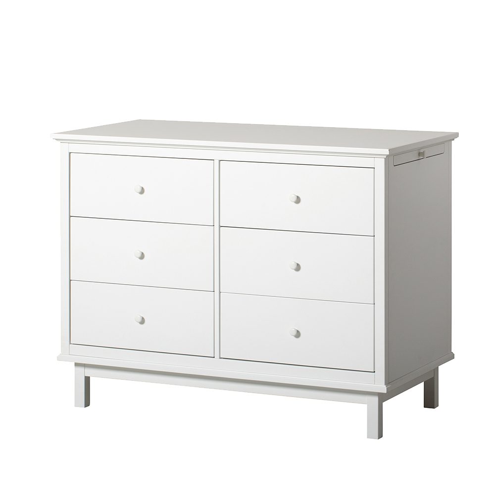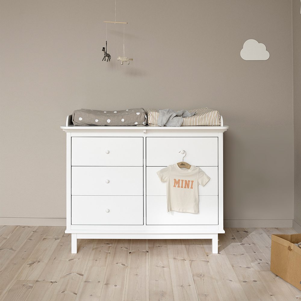 Met de praktische werkhoogte stelt de commode uit de Seaside collectie jou in staat om moeiteloos duizenden luiers te verschonen. En die luiers heb jij altijd binnen handbereik in een van de 6 ruime lades. Ook kan er gekozen worden voor een aankleedplank met opstaande zijkanten. Deze steekt aan de zijkanten 1 cm over, en de diepte van het werkblad gaat van 58 cm naar 76,5 cm. Zo blijft er nog genoeg ruimte over voor alle andere spullen die jij graag naast het aankleedkussen hebt, wel zo handig. Maar door het ruime werkblad passen er zelfs twee aankleedkussen naast elkaar op de aankleedplank, ideaal voor als er twee baby’s tegelijk verschoont moet worden.