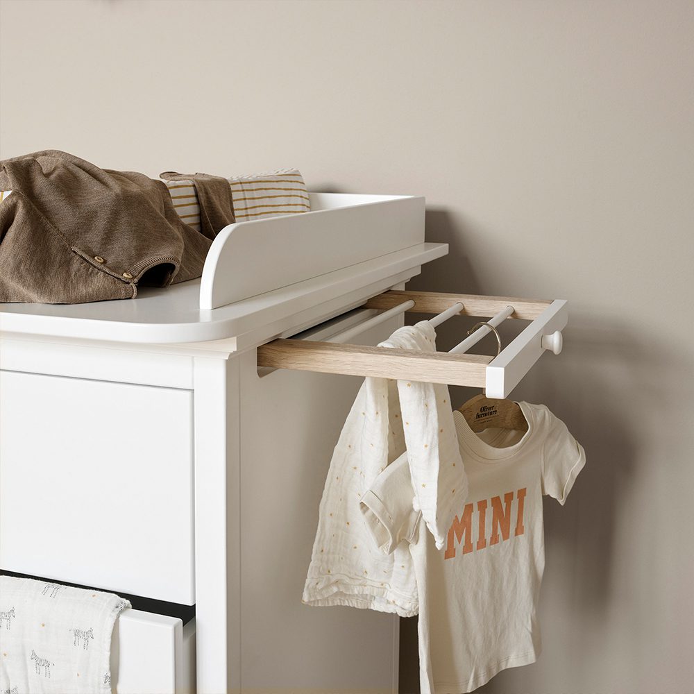 De commode kan verder uitgebreid worden met 2 uittrekelementen, weer zo een slim ontwerp van Oliver Furniture. Deze uittrekelementen zijn aan elke kant van de commode onder de bovenplaat van de commode geïntegreerd: één rek heeft stangen om kleding aan op de hangen (10 wasknijpers inbegrepen) en de andere kant is ontworpen als houder voor de bijbehorende waszak.