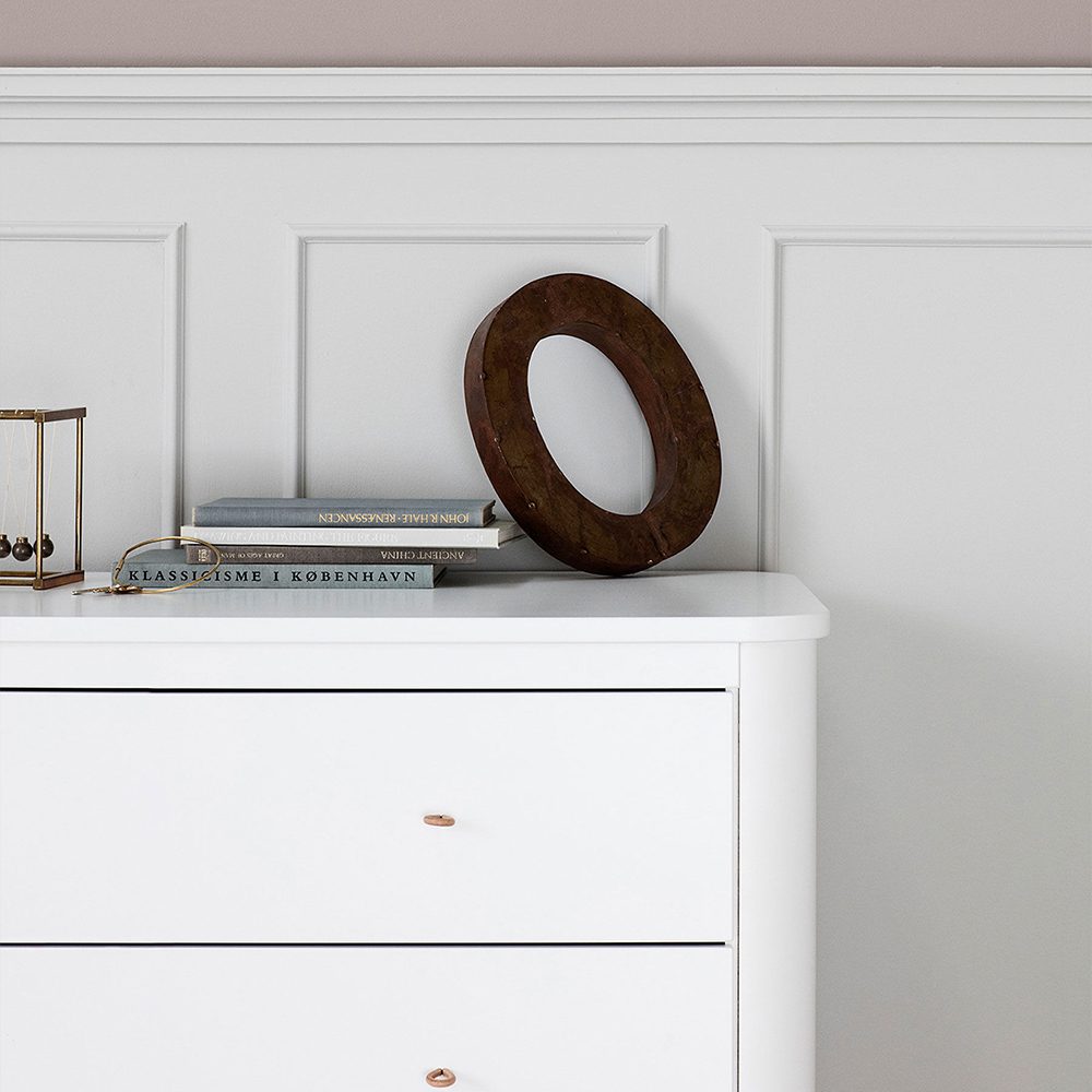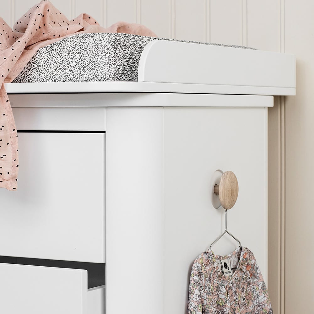 De commode en de aankleedplank zijn voorzien van ronde hoeken. Dat ziet er niet alleen mooi uit, maar zorgt ook voor een stukje extra veiligheid in de baby- en kinderkamer. Daarnaast zijn de lades voorzien van een soft-close systeem zodat kleine vingertjes er niet ongemerkt tussen bekneld kunnen raken. Een mooi detail zijn de leren handgrepen, maar ook de slim verborgen ophangknoppen aan beide zijkanten van de commode. Daar kun jij leuk wat decoratieve items aan hangen of dat nieuwe kledingsetje dat jij net hebt gescoord.