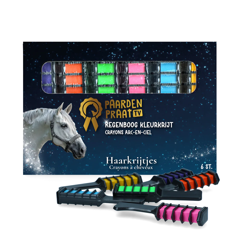 Heb je altijd al een eenhoorn willen hebben? Met deze vrolijke haarkrijtjes van Paardenpraat TV verander je je paard snel en makkelijk in een eenhoorn! Alle kleurtjes van de regenboog zitten samen in een verpakking.