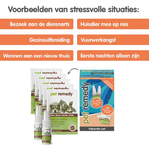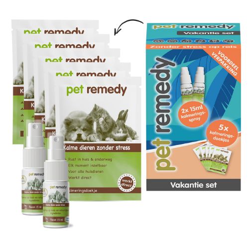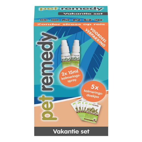 De Pet Remedy Vakantie Set heeft alles om jouw hond aan een nieuwe tijdelijke omgeving te laten wennen. Als je hond meegaat op vakantie kan zo’n lange autorit of een nieuw huis erg stressvol zijn. Maar ook als je dier thuisblijft veranderd er van alles. Ze gaan naar een oppas of een pension of er komt iemand hen verzorgen als ze thuis blijven. Deze set helpt je hond omgaan met deze situaties op een natuurlijke wijze.