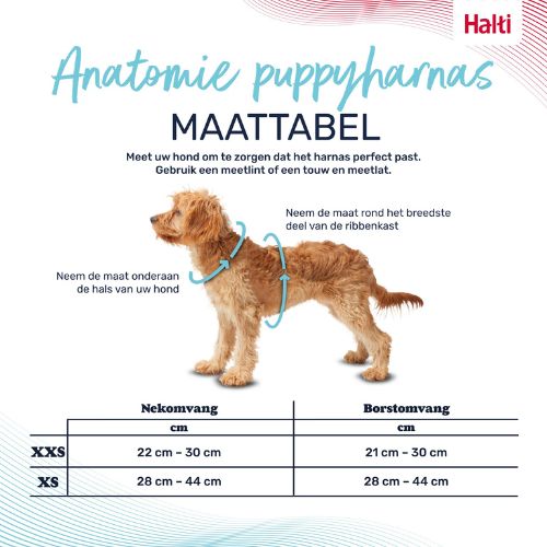Meet de nekomvang en borstomvang van je pup om de juiste maat te bepalen. Raadpleeg de maattabel op de productpagina. Valt je pup tussen twee maten? Kies dan de grotere maat voor extra comfort. Zodra de pup uit het tuig groeit, is de Halti Anatomy Harness de ideale opvolger.