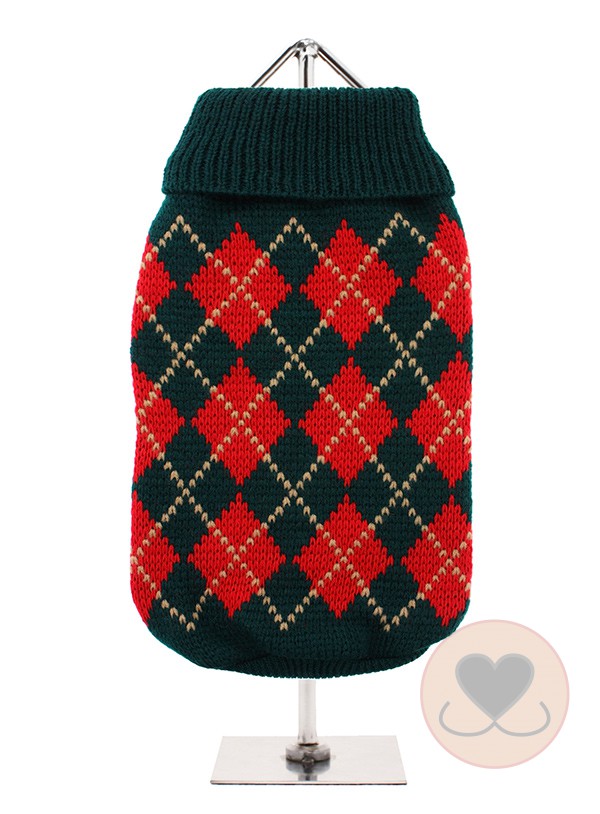 Leuke donkergroen gebreide trui met een rood-goud diamant patroon.