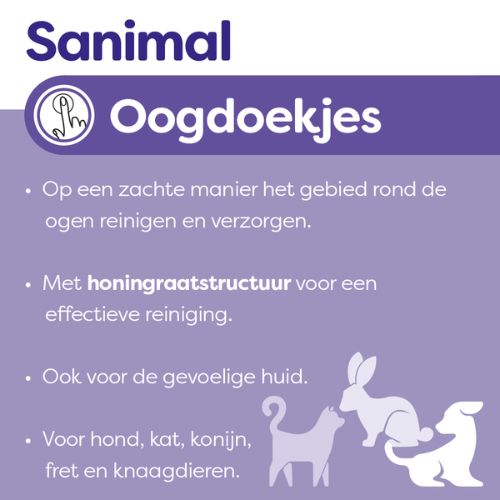 De Sanimal Oogdoekjes zijn ontzettend handig bij het reinigen van de ogen en de traanstrepen bij je hond. Maar ook bij je kat, konijn, fret en knaagdieren kan je deze doekjes veilig bij de ogen gebruiken. De individuele doekjes zijn heel handig voor snel en hygiënisch schoonmaken. Dankzij de honinggraat structuur is er een effectieve reiniging van en rond de ogen.