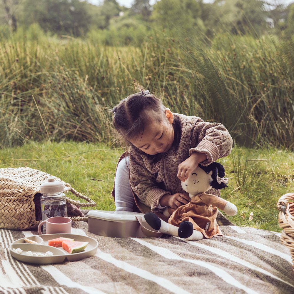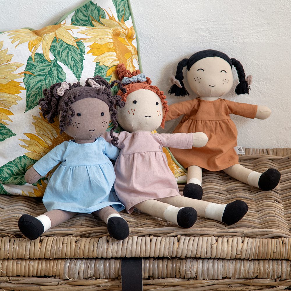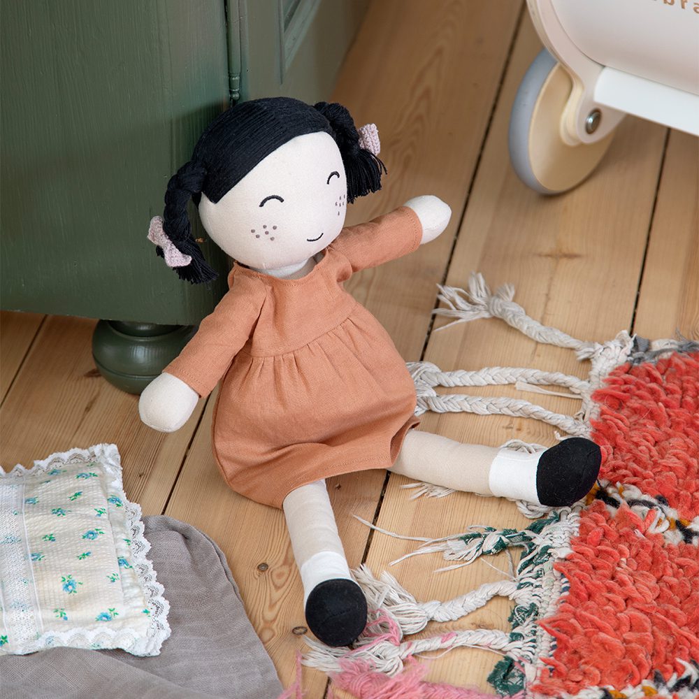 Met haar zachte jurkje, handgemaakte lokken en vrolijke sproetjes is Li de ideale speelkameraad voor elk kind. Deze 43 cm grote stoffen pop, gevuld met zacht gerecycled polyester, nodigt uit om te knuffelen, te verkleden en mee te nemen op avontuur. Haar jurkje is eenvoudig aan- en uit te trekken, zodat je kleintje zelf kan bepalen hoe Li er vandaag uitziet.