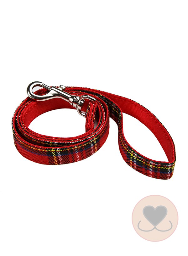 Deze stoffen riem is een mooie match met het luxe bont gevoerde rode tartan tuigje van Urban Pup.