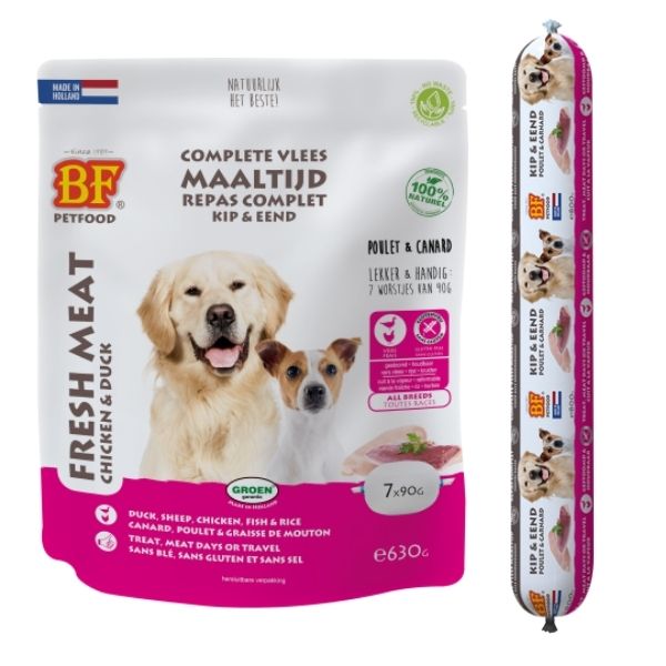 BIOFOOD vleesvoeding kip & eend is een natuurlijke, complete en houdbare hondenvoeding op basis van vers vlees, vis, orgaanvlees, rijst, schapenvet en natuurkruiden. Is uitermate geschikt voor vleesdagen, als traktatie, voor onderweg, smaakmaker, bij omschakeling naar ander voer of voor honden die slecht reageren op droogvoeding. Geschikt voor iedere hond, van pup tot senior.