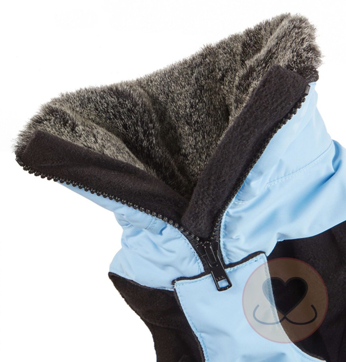 De verwarmende kraag is gemaakt van imitatiebont. Een zacht stretchrubber op de buik zorgt voor een comfortabele pasvorm. De jas moet over het hoofd van de hond worden getrokken en heeft drukknopen op de buik en een ritssluiting bij de nek om het aantrekken te vergemakkelijken.